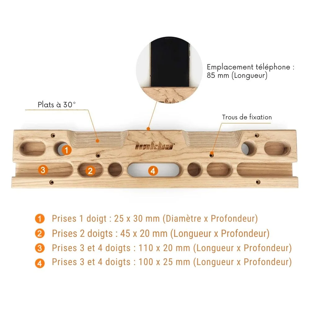 Grâce à ses réglettes multi-profondeurs (1 à 4 doigts) et ses prises inclinées, elle permet de travailler la force de préhension, la tenue de doigts et la traction, exactement comme sur le rocher.
